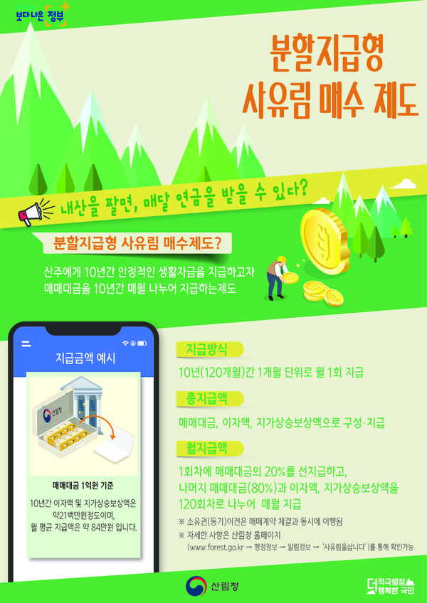 분할지급형 사유림매수제도는 매매대금(감정평가액)을 일시에 지급하는 기존 ‘(일시지급형) 사유림 매수제도’와는 달리 매매대금을 10년간 월단위로 나눠 연금처럼 지급하는 제도이다.