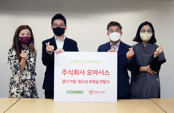 새벽배송 전문업체 오아시스마켓은 지난 3일 서울 서초구 소재 서울사무소에서 열매나눔재단에 어린이날 100주년을 기념 기부금을 전달했다.