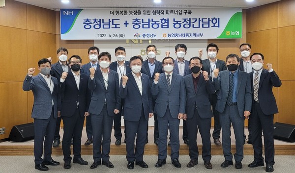 충남도는 지난달 26일 농협충남세종지역본부 회의실에서 더 행복한 농업·농촌을 위한 ‘충남도-충남농협 간 농정 간담회’를 개최했다. 코로나19로 2년 만에 열린 이번 농정간담회에는 임승범 충남도 농림축산국장과 김용철 농협충남세종본부 부본부장 등 16여 명이 참석했다.