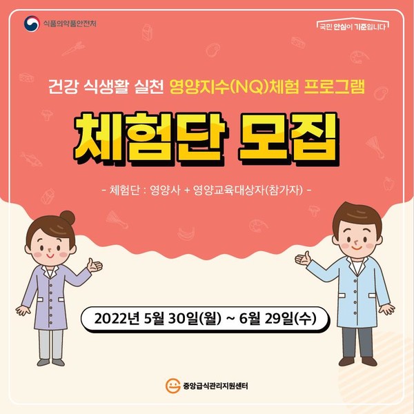 식품의약품안전처는 국민의 건강한 식생활 실천을 돕기 위해 개인별 영양상태 등을 평가한 후 식습관 개선 방법을 지원하는 ‘건강식생활 실천 영양지수(NQ) 체험 프로그램 참가자를 다음 달 29일까지 모집한다.