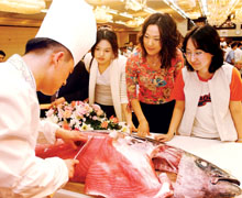 한국원양어업협회가 지난달 29일 서울 여의도 소재 63빌딩 코스모스홀에서 국내 처음으로 개최한 `참치데이 참치라이브쇼''에서 전문 요리사가 60kg 참치를 부위별로 해체하는 광경을 연출해 참석자들의 탄성을 자아내게 했다.