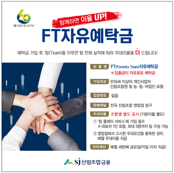 SJ산림조합은 농림어업인과 개인사업자 등 2인 이상 함께할 시 우대이율을 지급하는 FT(Foresty Team) 자유예탁금 상품을 지난 1일 출시했다고 밝혔다.