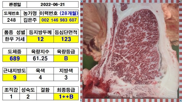 농협사료 전남지사에 따르면 이번에 출하된 슈퍼한우는 그 크기뿐만 아니라 도체중 689kg에 등급 1++B, 근내지방도 9, 등심단면적 123㎠, 육량지수 61.25% 등 모든 지수에서 우수한 성적을 거두며 2000만 원이 넘는 정산금액을 받았다.