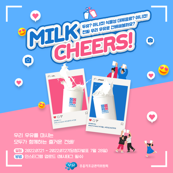 오는 27일까지 진행되는 이번 캠페인은 남녀노소 누구나 참여할 수 있으며 국산 우유를 건배하는 방향을 선택해 인증샷을 촬영한 후 ‘#MILKcheers!’, ‘#국산우유’, ‘#우리우유’라는 해시태그를 달아 개인 인스타그램 계정에 업로드하면 된다.