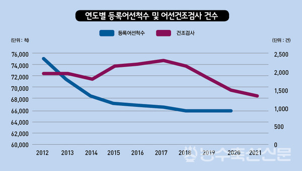 한국해양교통안전공단에 따르면 국내 등록어선척수는 2012년 7만5031척에서 2014년 6만8417척으로 줄어든데 이어 2020년 6만5744척까지 줄었다. 연간 어선건조 척수 역시 감소세다. 어선건조검사 건수는 2012년 1976건에서 2017년 2296건까지 늘었다가 지난해에는 1310건으로 줄었다.