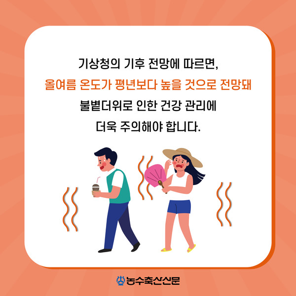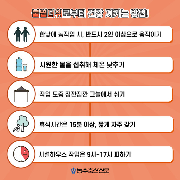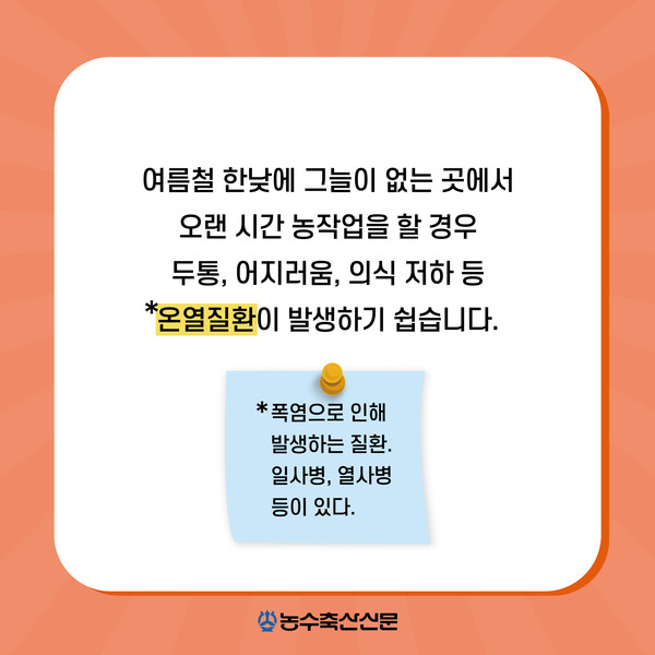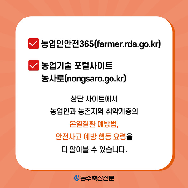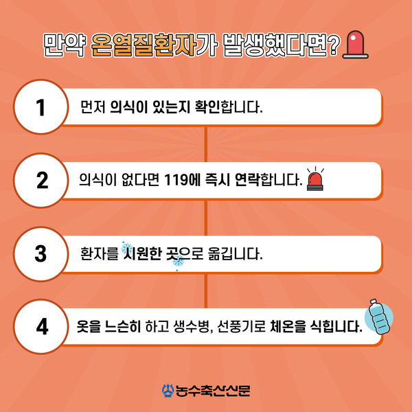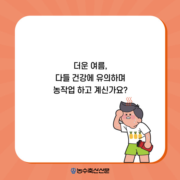 [농수축산신문=농수축산신문] 키워드 #농작업 #온열질환 농수축산신문 webmaster@aflnews.co.kr 다른기사 보기 저작권자 © 농수축산신문 무단전재, 재배포 및 AI학습 이용 금지 당신만 안 본 뉴스 [AFL칼럼] ASF 백신 개발, ‘K-방역’의 새 지평 열까 서울 영등포농협 사회공헌실천재단, '가정의 달 이벤트' 경품 증정식 개최 예산군, ‘힐링·건강·나눔’으로 주민 삶의 질 높인다 영등포농협 사회공헌실천재단, 동작구 '사랑의 온도탑' 제막식 '1호 주자'로 나서 지역사회 온기 확산 물꼬 터 차기 농협 축산경제 대표이사 선거 3파전 영농형태양광, 임차농 보호장치 마련을…정부, 투기 방지법 ‘밑그림’ [Issue+] 2026 국제곡물시장 전망 [AFL칼럼] ASF 백신 개발, ‘K-방역’의 새 지평 열까 댓글삭제 삭제한 댓글은 다시 복구할 수 없습니다. 그래도 삭제하시겠습니까? 비밀번호 닫기 기사 댓글 0 댓글 접기 로그인 후 이용 가능합니다. 댓글 내용입력 비회원 로그인 이름 비밀번호 댓글 내용입력 댓글쓰기 계정을 선택하시면 로그인·계정인증을 통해 댓글을 남기실 수 있습니다. 회원 로그인 비회원 글쓰기 이름 비밀번호 자동등록방지 로그인 옵션 창닫기 주요기사 숭례문 앞에 모인 ‘유령농부’들…유기농업 2배 확대 결의 플랜티팜, 사우디 성지 메디나에 K-스마트팜 구축한다 산림경영지도 우수사례 최우수상에 이이섭 상주시산림조합 지도원 세포배양 인조축산물, 안전성 문제 여전히 화두 [Issue+] 지속가능한 농업은 우리의 사명...ESG 경영 발굴·확산 ‘주목’ [농수축산신문-수협중앙회 공동기획] 착용海요 구명조끼 안전海요 우리바다 ⑦ 제주시 이보라 조일호 선장