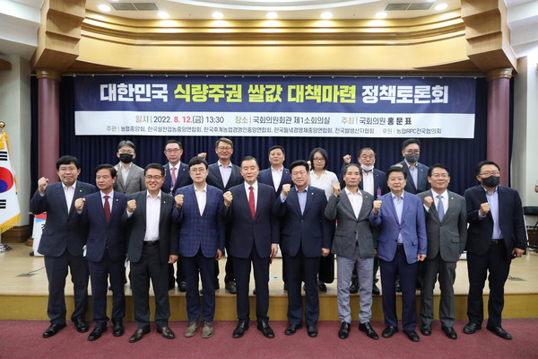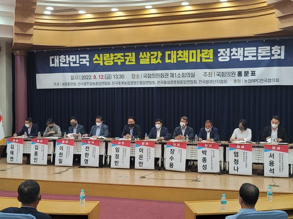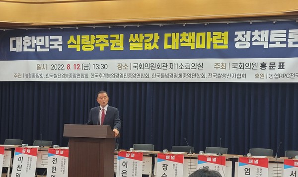 홍문표 의원(국민의힘, 홍성·예산) 주최로 지난 12일 국회의원회관 제1소회의실에서 진행된 ‘대한민국 식량주권 쌀값 대책마련을 위한 정책토론회’ 쌀 관련 생산자단체 관계자 등 300여 명이 자리를 가득 메우며 현장의 뜨거운 관심을 실감케 했다.