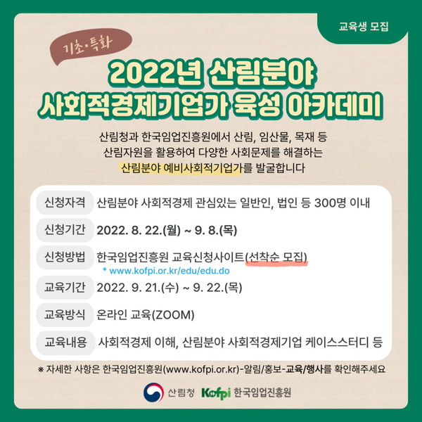 이번 교육은 온라인 교육(Zoom)으로 진행되며 △사회적경제 △사회적미션·비즈니스모델 수입 △사업계획서 작성 △산림분야 사회적경제기업 사례연구 등 산림분야 사회적경제에 대한 전반적인 기초소양교육을 수강할 수 있다.