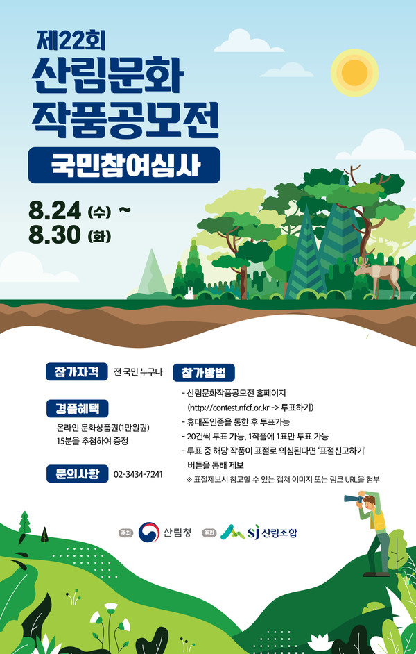 산림조합중앙회는 24일부터 오는 30일까지 제22회 산림문화작품공모전 온라인 국민 참여 심사를 진행한다고 밝혔다.