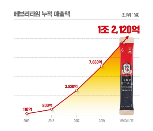‘홍삼정 에브리타임’ 출시 이후 소비자 반응은 뜨거웠다. 2013년 90억 원에 불과하던 ‘홍삼정 에브리타임’의 연매출은 2015년 480억 원, 2016년 1000억 원을 돌파했고, 2021년에는 1700억 원을 기록하며 메가 브랜드로 성장했다.