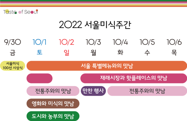 2022 서울미식주간은 서울 대표 식당 100선을 소개하고 선정 식당의 음식을 맛보는 시간으로 마련된다. 또한 도시와 농부, 영화, 재래시장 등 다양한 영역과 미식의 협업을 선보이는 한편 전통주 수업 등 서울의 미식 문화를 다양한 방법으로 경험하는 체험행사도 준비됐다.