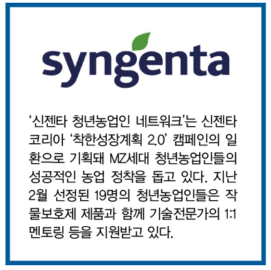 남형수 신젠타코리아 경북지점 기술영업팀장은 신젠타코리아의 청년농업인 네트워크가 농업인에게는 다양하고 정확한 지식 전달 창구로, 신젠타코리아에는 현장의 여건과 의견 등을 제대로 파악할 수 있는 정보 통로의 역할을 하며 양쪽 모두의 탄탄한 성장 토대가 될 것이라 확신했다.