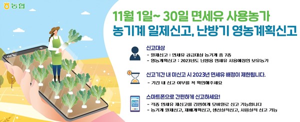 신고대상 농어업인은 관리농협에서 배부한 신고서에 농기계 보유 여부를 작성하거나 난방기 재배계획(재배작목, 재배면적 등)을 기재해 면세유 관리농협에 제출해야 한다. 방문신고가 어려운 경우 농협하나로앱 ‘농업용 면세유 모바일 시스템’을 통한 모바일 신고도 가능하다.