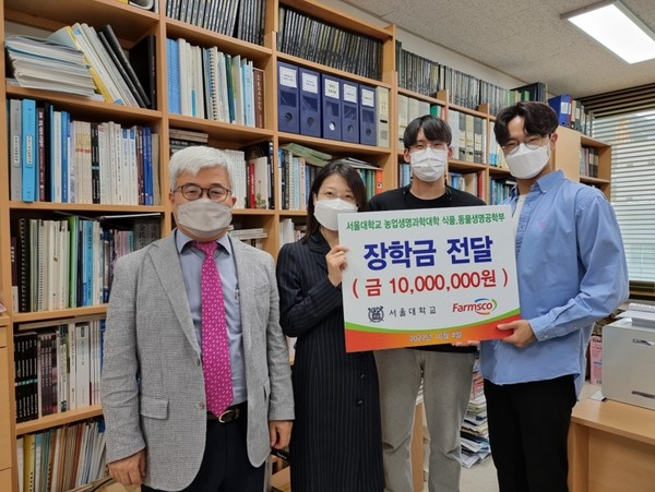 팜스코는 1973년 사업을 시작한 이래 고객과의 동반성장을 추구하며 축산식품전문기업으로 성장·발전해 가고 있고 있으며 ‘축산식품 산업을 선도해 고객의 행복한 삶에 기여합니다’라는 사명으로 사업을 지속 영위하고 있다. 또한 대한민국 농축산 분야 발전의 밑거름이 될 인재의 육성을 위해 지속적으로 장학금을 지원하고 있으며 이번 행사에서는 서울대 학생 2명에게 총 1000만 원의 장학금을 전달했다.