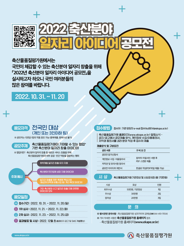 축산물품질평가원(이하 축평원)은 국민이 체감할 수 있는 축산분야 일자리 창출을 위해 오는 20일까지 ‘2022년 축산분야 일자리 아이디어 공모전’을 개최한다.