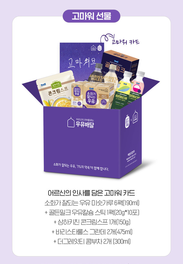 고마워 선물은 소화가 잘되는 우유, 골든밀크, 바리스타룰스, 더그레잇티 콤부차 등 소비자가 3만9000원 상당의 매일유업 대표 제품과 어르신들의 손글씨 인사 카드로 구성됐다.
