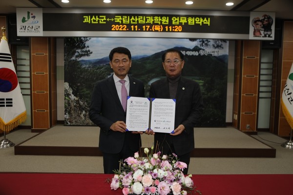 충북 괴산군청과 국립산림과학원은 지난 17일 괴산군청 회의실에서 미이용 바이오에너지, 국산목재활용 등 산림 분야 협력사업을 발굴하고 기술교류를 강화하기 위한 업무협약(MOU)를 체결했다.