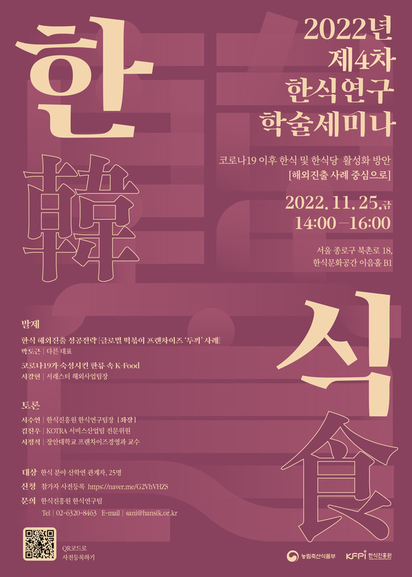 한식진흥원은 오는 25일 한식문화공간 이음홀에서 ‘2022년 제4차 한식연구 학술세미나’를 개최한다.