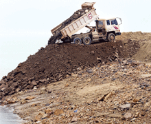 서울행정법원의 공사중단 판결 나흘만인 지난 19일 오후 새만금간척사업에 대한 보강공사 결정이 내려져 방조제 유실 위기는 넘겼지만 5~6대의 차량만이 복구공사에 투입돼 을씨년 스럽기는 마찬가지이다. 사진은 방조제 보강공사 결정에 따라 트럭을 동원해 공사중단 판결로 유실된 방조제에 흙을 날라 붓는 모습.