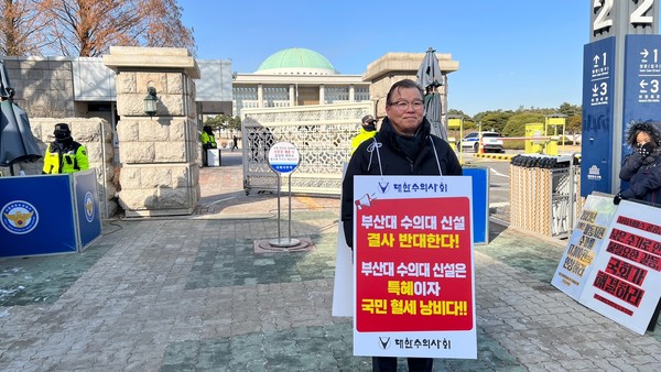 대한수의사회는 지난 19일 허주형 회장을 시작으로 오는 21일까지 사흘 간 국회 앞에서 1인 시위에 돌입, 20일에는 우연철 사무총장이, 21일에는 최종영 농장동물진료권쟁취특별위원장과 김은석 동물의료관련법령연구회장이 각각 1인 시위를 한다.