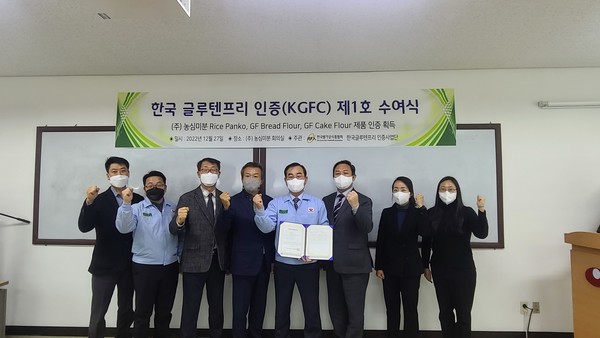 농림축산식품부와 (사)한국쌀가공식품협회는 지난 27일 충남 아산시 소재 ㈜농심미분에서 ‘한국 글루텐프리 인증 1호 수여식’<사진>을 개최했다.