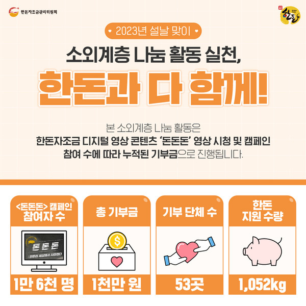 이번 기부는 지난해 11월 공개된 디지털 영상 콘텐츠 ‘돈돈돈’ 영상 시청과 캠페인 참여 수에 따라 조성된 것으로 보육원·아동센터·장애인 보호시설·노약자 운영시설 등 전국 비영리 단체 총 53곳에 한돈 1052kg을 전달했다.
