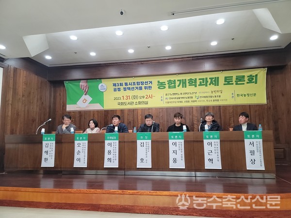 좋은농협만들기운동본부, 국민과함께하는농민의길, 전국사무금융서비스노동조합, 전국협동조합노동조합, 더불어민주당 이개호·신정훈·이원택 의원, 윤미향 의원(무소속) 주최로 지난달 31일 국회도서관 소회의실에서 열린 ‘제3회 동시조합장선거 공정·정책선거를 위한 농협개혁과제 토론회’에서 참석자들은 농협 개혁을 위한 과제로 집중된 지배구조, 불투명한 사업 등을 문제로 제기하며 농업인이 중심이되는 개혁의 필요성을 강조했다.