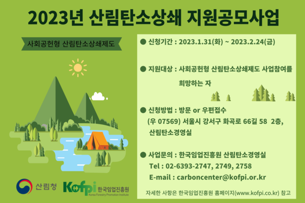 한국임업진흥원이 오는 24일까지 2023년도 사회공헌형 산림탄소상쇄사업 사업계획 작성 지원 공모사업 대상자를 모집한다.