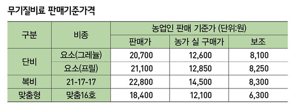 여기에 정부와 지자체·농협이 2021년 8월 대비 가격 인상 차액의 80%를 연중 지원함에 따라 농업인들은 2021년 8월과 비교해선 15% 인상, 정상가 대비 31% 인하된 톤당 평균 67만3000원에 무기질비료를 구입할 수 있게 됐다.