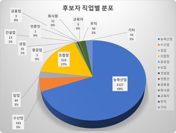 3080명의 전체 후보자를 직업별로 살펴보면 농축산업 종사자가 2127명(69%)으로 가장 많았고 다음으로는 조합장 519명, 수산업 163명, 임업 84명, 무직 56명, 상업 25명, 건설업 13명, 회사원 11명 등의 순으로 나타났다.