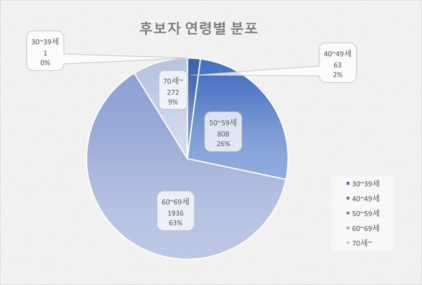 연령대별로는 60세 이상 69세 이하 후보자가 1936명(62.8%)으로 가장 많았으며 50세 이상 59세 이하 후보자가 808명(26.2%), 70세 이상이 272명(8.8%), 40세 이상 49세 이하가 63명(2%)이며 30세 이상 39세 이하 최연소 후보자는 1명으로 1984년생이다. 또한 후보자 가운데 여성은 36명으로 1.17%에 불과했다.