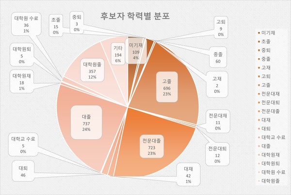 학력별로는 고졸이 696명으로 가장 많았고 다음으로 대졸 737명, 전문대졸 723명, 대학원 357명, 중졸 60명, 대퇴 46명, 대재 42명, 대학원 수료 36명, 대학원재 18명, 초졸 15명, 고퇴 9명, 대학교 수료 5명, 대학원퇴 5명 등의 순으로 나타났으며 109명의 후보자는 학력을 기재하지 않았다.