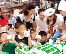 우유를 테마로 산뜻하게 랩핑 디자인한 45인승 대형버스 2대가 서울을 비롯한 부산·대구·광주·대전·인천 등 전국 6대도시를 순회하며 시내 중심가와 피서지 등에서 우유소비촉진행사를 벌이고 있다. 사진은 서울 명동에서 벌어진 홍보 이벤트 모습.