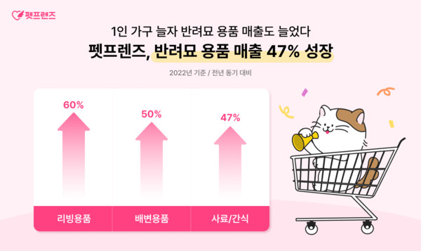 품목별로는 캣타워, 급식기 등 리빙용품이 60%, 모래, 매트 등 배변용품이 50%, 사료, 간식 카테고리가 47% 성장했다.