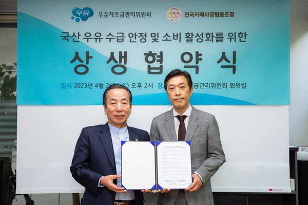 우유자조금관리위원회(위원장 이승호, 이하 우유자조금)는 지난달 26일 국산 우유 수급안정과 소비 촉진을 위해 전국카페사장협동조합과 업무협약을 체결했다고 밝혔다.