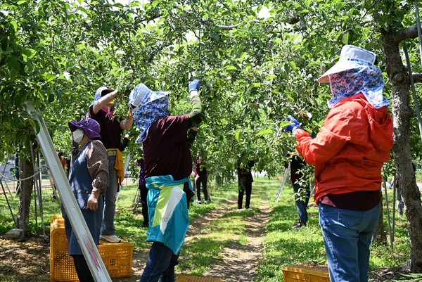 서울 관악농협(조합장 박준식) 주부대학 36기생 110명과 임직원 20명(총 130명)은 11일 문경 점촌농협 관내 사과과수 농가 3곳(2만5500㎡)에서 사과 열매솎기 작업을 실시했다.