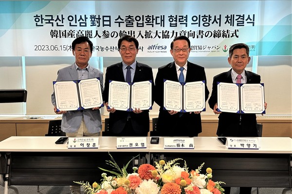 한국농수산식품유통공사(aT)·알프렛사헬스케어(주)·고려인삼과학(주)·㈜고려무역재팬은 지난 15일 서울 양재동 aT센터에서 한국산 인삼의 일본 수출 확대를 위한 업무협약을 체결했다.