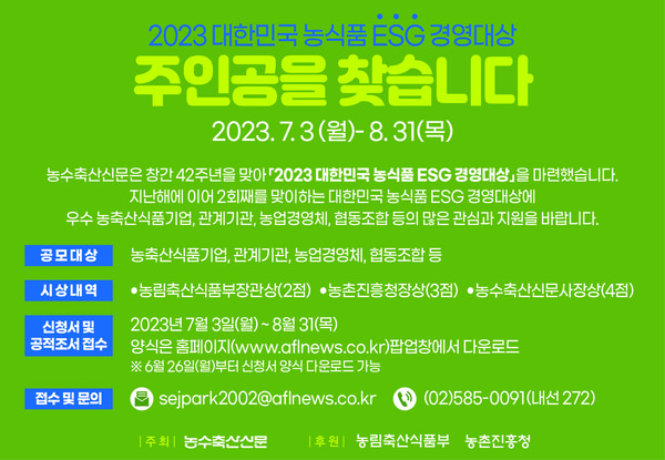 주요기사 숭례문 앞에 모인 ‘유령농부’들…유기농업 2배 확대 결의 플랜티팜, 사우디 성지 메디나에 K-스마트팜 구축한다 산림경영지도 우수사례 최우수상에 이이섭 상주시산림조합 지도원 세포배양 인조축산물, 안전성 문제 여전히 화두 [Issue+] 지속가능한 농업은 우리의 사명...ESG 경영 발굴·확산 ‘주목’ [농수축산신문-수협중앙회 공동기획] 착용海요 구명조끼 안전海요 우리바다 ⑦ 제주시 이보라 조일호 선장
