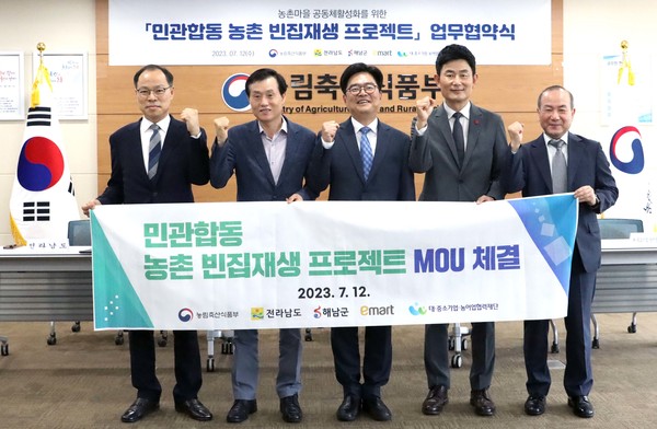 이마트는 지난 12일 농식품부 대회의실에서 농식품부, 전남도, 해남군, 대·중소기업 농어업협력재단과 5자 민관합동 농촌 빈집재생 프로젝트 업무협약을 체결했다. 이번 협약을 통해 이마트는 민관합동으로 농촌에 방치된 빈집을 정비한다.
