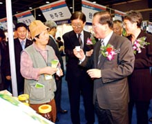 `2003 청정전북 우수 상품 페어''가 지난 23일 서울 양재동 aT센터 제2전시장에서 개최돼 출품업체와 유통업체간에 3500억원이 넘는 구매계약을 체결하는 성과를 거두었다. 사진은 강현욱 전북도지사를 비롯한 내빈들이 전시장을 둘러보고 있다.