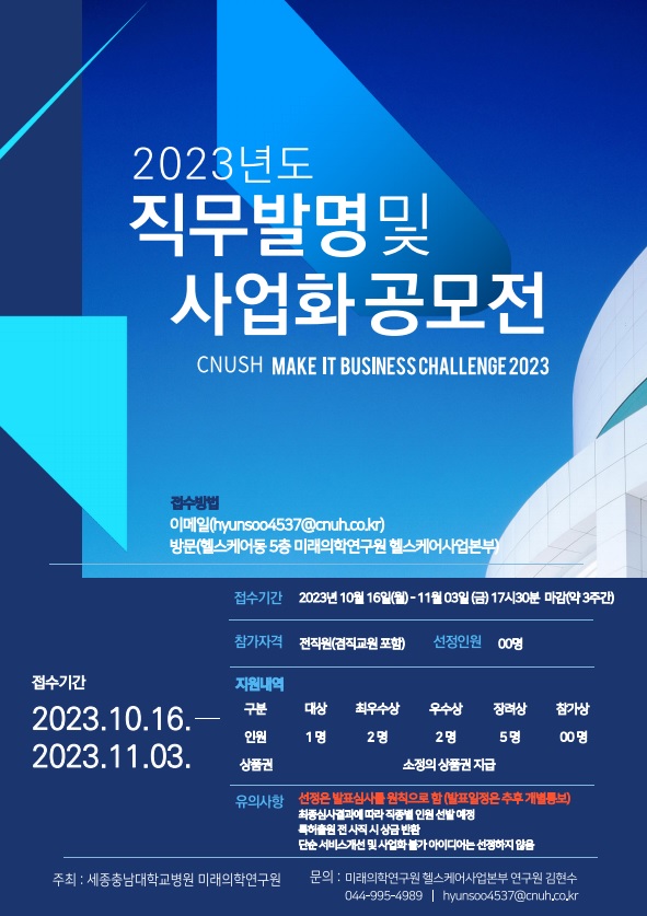 세종충남대학교병원(원장 권계철) 미래의학연구원은 전 직원을 대상으로 2023년도 직무발명과 사업화 공모전을 개최한다고 19일 밝혔다.