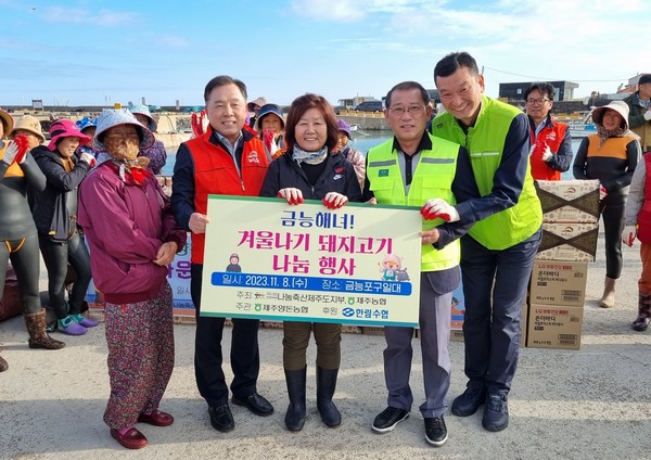 제주양돈농협(조합장 고권진)과 제주농협(본부장 윤재춘), 한림수협(조합장 양기호)은 지난 8일 범농협 ESG 활동으로 ‘농협과 함께하는 플로깅’ 캠페인 행사와 더불어 금능리 어르신들과 취약계층 위한 돼지고기 나눔과 한림수협에선 생필품을 전달하는 행사도 함께 진행했다.
