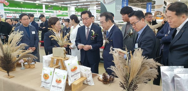농협경제지주는 지난 22일 농협 하나로마트 양재점에서 가루쌀 기획전 기념행사를 열었다. 이날 행사에는 정황근 농림축산식품부 장관과 이성희 농협중앙회장, 국내에서 단일 면적으로 가장 넓은 규모로 가루쌀을 재배하는 김대남 꿈에영농조합법인 대표, 식품기업 관계자 등이 참석했다.