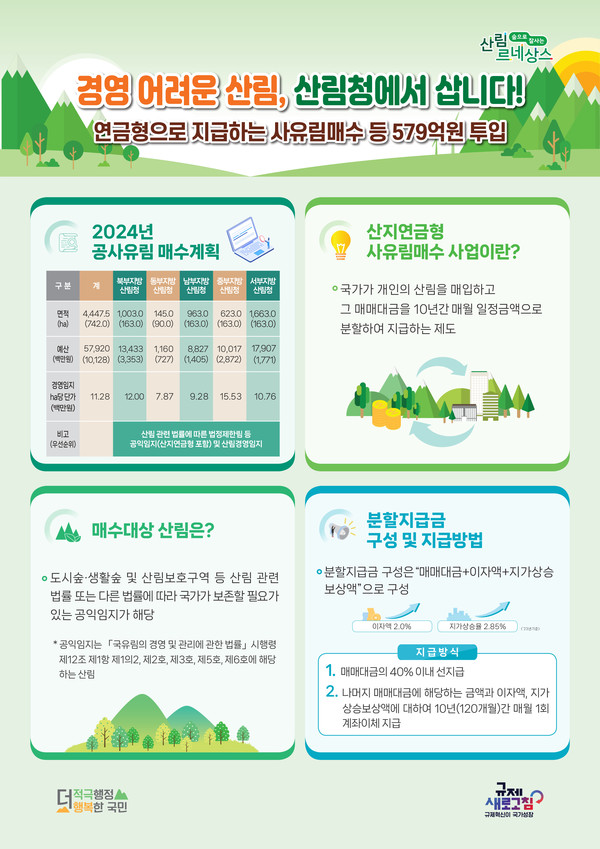 산림청이 산림 생태계 보전, 재해방지, 산림복지 강화 등 공익가치 증진을 위해 올해 579억 원을 투입해 여의도 면적 15배에 달하는 사유림 4447ha를 매수한다.