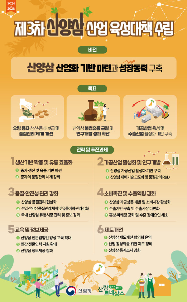 특히 산림청은 경남 함양에 위치한 산양삼 특화산업진흥센터와 강원 평창의 산양삼 융복합지원센터를 기반으로 가공상품 개발과 제작을 지원하고 품질관리 R&D 확대와 수입 산양삼 불법유통 방지를 위해 현행 제도를 보완할 계획이다.
