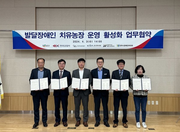 한국마사회 장수목장은 지난 3일 발달장애인의 활동 지원을 위해 전주시, 한국도로공사·한국자산관리공사 전북본부 등 전북도 기관과 치유농장(케어팜) 활성화를 위한 업무협약을 체결했다.
