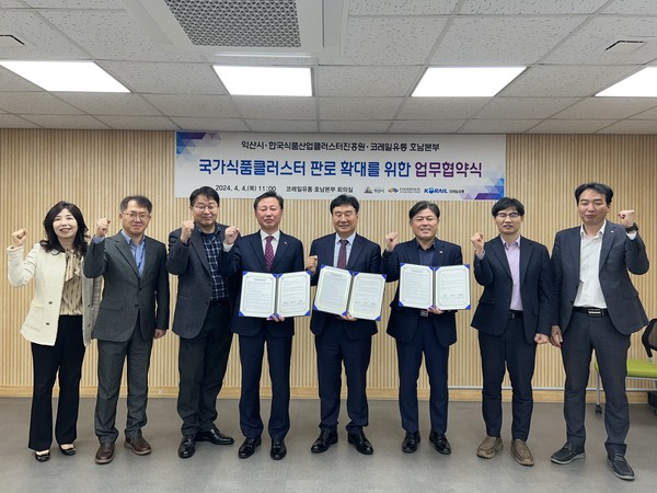 식품진흥원은 지난 4일 코레일유통 호남본부에서 코레일유통, 익산시와 ‘국가식품클러스터 판로 확대를 위한 업무협약’을 체결했다. 이날 협약식에는 김영재 식품진흥원 이사장, 허전 익산시 부시장, 윤병일 코레일유통 호남본부장과 관계자 등이 참석했다.