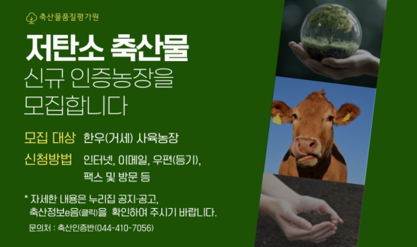 한편, 축산물품질평가원은 16일까지 2024년도 저탄소 축산물 신규 인증 농장을 모집하고 있다. 참여를 희망하는 한우농장은 별도 누리집(축산정보e음) 등으로 신청할 수 있으며, 자세한 내용은 축산물품질평가원 대표 누리집 공지사항을 참고하면 된다. 인증 농장은 배출량 산정 컨설팅과 현장 심사, 전문가 심의 등을 거쳐 최종 선정될 예정이다.