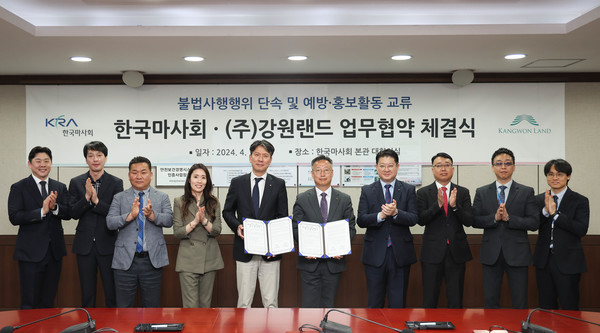 한국마사회와 강원랜드는 지난 18일 경기도 과천시 마사회 본관에서 송대영 마사회 경마본부장과 이광훈 강원랜드 카지노본부장 등 기관 관계자들이 참석한 가운데 ‘불법 사행행위 단속 및 예방·홍보활동 교류 업무협약(MOU)'을 체결했다.