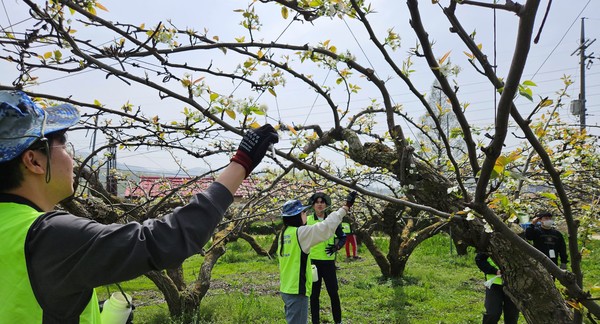 농협경제지주 축산사료자재부 직원들은 지난 17일 봄철 농번기 인력 부족의 어려움을 겪고 있는 경기 안성시 소재 과수농가를 방문해 농촌 일손돕기를 실시했다.